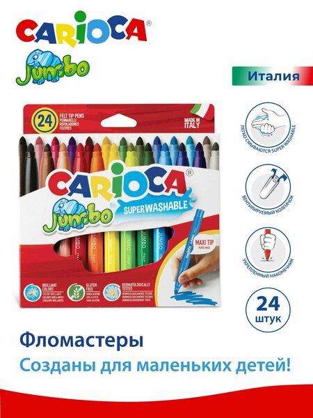 Carioca Jumbo Фломастеры, на водной основе. 24 штук в наборе. Упакованы в картонную коробку. Эти фломастеры специально созданы для детей младшего возраста. У фломастеров утолщенный 8-ми гранный корпус, удобный для детской руки. Наконечник изготовлен из прочного фетра. Чтобы предотвратить его вдавливание, что случается при рисовании ребенком, производитель придумал прочную фиксацию с блокировкой наконечника. Наконечник пулевидной формы, имеет диаметр 6 мм. Малышам будет легко рисовать такими фломастерами. Еще один безопасный элемент детских фломастеров - вентилируемый колпачок. При случайном его заглатывании, ребенок не задохнется. Фломастеры в наборе CARIOCA Jumbo изготовлены в Италии. В них используются цветные легкосмываемые чернила - SUPERWASHABLE! В основе чернил пищевые или косметические красители, безопасные для ребенка. Чернила дерматологически протестированы. Цвета фломастеров яркие и насыщенные. Смываемые фломастеры - это еще и помощь маме! Набор фломастеров Carioca Jumbo 24 штуки - отличный подарок при походе в гости к ребенку. Вы будете уверены в качестве и безопасности продукта с европейским качеством. Carioca - известный итальянский производитель детских товаров для творчества и развития детей.