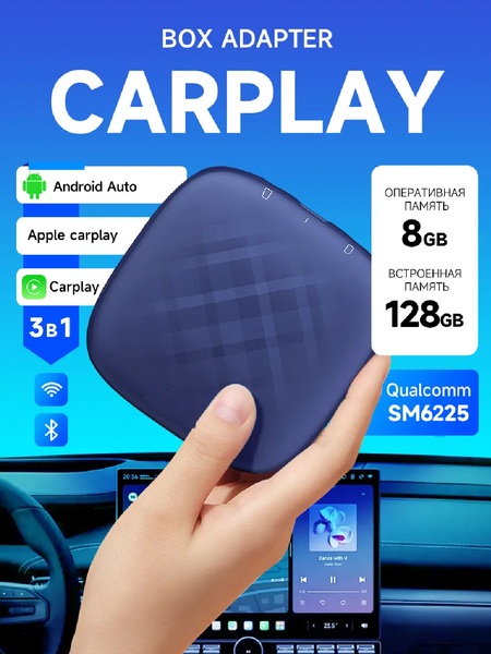 arPlay и AndroidAuto беспроводной с Android 13 и YouTube, Autek Box 8+128Гб Autek c200 подходит для большинства моделей автомобилей, поддерживающих проводной carplay Autek C200 Android box 8GB (RAM) 128GB (ROM) - это компактный usb-мультимедиа центр работающий на собственной операционной системе Android, который позволяет вам получить полноценный беспроводной Apple CarPlay или Android Auto без необходимости подключать телефон по кабелю в USB гнездо вашего автомобиля! Комплект произведён на сертифицированном заводе популярного бренда Carlinkit. Аппаратные возможности Система: Android 13 Процессор: Qualcomm QCM6225, octa-core 64-bit ARM Cortex-A53 processor 1.8GHz 11nm process Граф. процессор: Adreno 506 ОЗУ: 8 Гб. RAM ПЗУ: 128 Гб. RAM WIFI частоты: 802.11 a/b/g/n/ac, 2.4G+5G Bluetooth версия: 4.2 BLE+5.0 BLE Входное напряжение: 5V±0.2V 1.0A Потребляемая мощность: 3W Материал: ABS+PC Разрешение: Адаптивное (сохраняет исходное разрешение протокола) Беспроводной CarPlay: iPhone 6 и выше / iOS 10.0 и выше; Беспроводной Android Auto: телефоны Android с Android 10.0 и выше, для некоторых требуется Android 11.0 и выше. ОС автомобиля: поддержка оригинального головного устройства с проводной функцией CarPlay Порты: LED индикатор, порт Type-C, разъем дляTF карты, слот для SIM-карты Функционал: Возможность независимого приема интернета через встроенную сим-карту и раздачи его в автомобиле через WI-FI. 4 / 8 Гб оперативной памяти. 64 / 128 Гб встроенной флеш-памяти для Вашего сохраненного мультимедийного контента. Основная операционная система Android позволяет на рабочий стол вашего головного устройства установить любое приложение из многочисленного списка из Google Play Market. Просмотр YouTube. Просмотр цифрового ТВ. Установка любого навигационного софта. Функция беспроводного Apple CarPlay. Функция беспроводного Android Auto. Bluetooth 4.2 BLE+5.0 BLE Обязательное условие - требуется поддержка проводного Apple CarPlay в головном устройстве вашего автомобиля! Что мы получаем? Ваш телефон в кармане или сумке, а CarPlay или Android Auto работает в беспроводном исполнении. Вы можете независимо смотреть YOUTUBE или Цифровое ТВ Гарантийный срок 1 год Комплектация Autek C200 , кабель USB - Type C, кабель Type C - Type C, инструкция