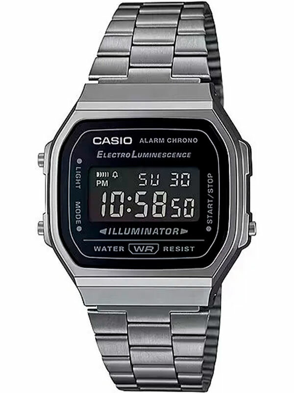 Электронные кварцевые мужские наручные часы Casio Vintage A168WEMB-1B с цифровой индикацией времени. Калибр механизма — 3298. Функциональность данной модели: формат времени 12/24, автоматический календарь с установкой 28 дней на февраль, будильник, сигнал начала часа, секундомер с точностью 1/100 секунды и измерением до 59 минут 59,99 cек, электролюминесцентная подсветка циферблата. Стальной браслет миланского плетения. На браслет нанесено стойкое PVD покрытие. Инверсный дисплей. Водонепроницаемость WR (3 атм). Размеры корпуса: (ШxВxТ) 36.3x38.6x9.6 мм. Гарантийный срок — 3 года (1 год от производителя + 2 года от магазина).