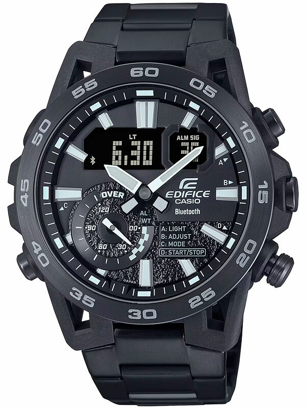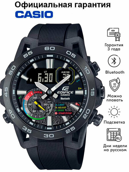 Кварцевые мужские наручные часы Casio ECB-40MP-1A коллекции Edifice с технологией Bluetooth® Smart. Двойная (цифровая+аналоговая) индикация времени. Модельный ряд Sospensione, вдохновленный подвеской Formula Car. Калибр механизма — 5708. С помощью Bluetooth® вы можете подключить часы к смартфону и получить доступ к полезным функциям. Часы автоматически связываются с телефоном через Bluetooth® и проверяют точность времени 4 раза в сутки. Возможности Bluetooth в данной модели: С помощью специального приложения CASIO WATCHES возможно установить время в конкретном городе (300 городов), установить точное текущее время, установить будильник, просмотреть показания секундомера, подстроить положение стрелок, записать данные о времени и местоположении (TIME and PLACE). Функция поиска телефона - можно включить тоновый сигнал на телефоне, что позволит быстро найти телефон. Функциональность данной модели: формат времени 12/24; индикация даты и дня недели (в том числе на Русском языке); мировое время в 38 городах (в 38 часовых поясах); двойное время; автоматический календарь до 2099 года; 5 ежедневных будильников; сигнал начала часа; секундомер с измерением до 23 часов 59 минут 59 cек; таймер обратного отсчета (диапазон времени 24 часа), Двойная диодная подсветка циферблата с функцией авто (включается при наклоне часов на 40°) и возможностью выбора времени свечения (1.5 или 3 секунды); функция выключения звука нажатия кнопок (Mute). Функция ручного перемещения стрелок (стрелки перемещаются в сторону, чтобы обеспечить беспрепятственный просмотр содержимого цифрового дисплея). Стрелки и метки покрыты необритовым (Neobrite) люминесцентным напылением (светятся в темноте). Стальной корпус усиленный карбоном. Полимерный ремешок. На стальную часть корпуса нанесено стойкое PVD покрытие. Водонепроницаемость WR100 (10 атм). Размеры корпуса: (ШхВхТ) 48x52.4x12.7 мм Гарантийный срок — 3 года (1 год от производителя + 2 года от магазина).