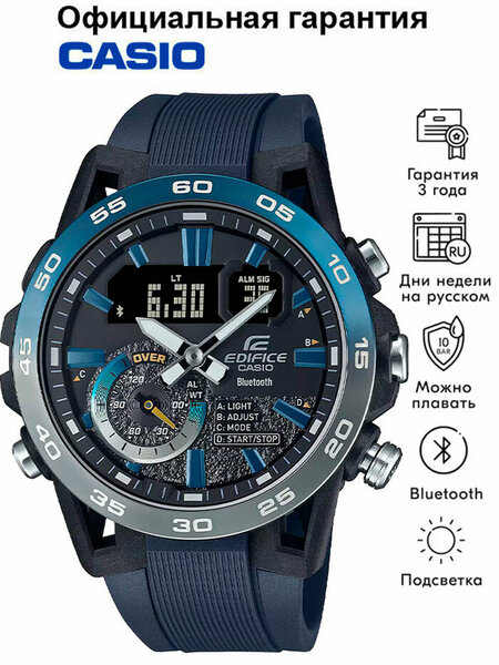 Кварцевые мужские наручные часы Casio ECB-40NP-1A коллекции Edifice с технологией Bluetooth® Smart. Двойная (цифровая+аналоговая) индикация времени. Модельный ряд Sospensione, вдохновленный подвеской Formula Car. Калибр механизма — 5708. С помощью Bluetooth® вы можете подключить часы к смартфону и получить доступ к полезным функциям. Часы автоматически связываются с телефоном через Bluetooth® и проверяют точность времени 4 раза в сутки. Возможности Bluetooth в данной модели: С помощью специального приложения CASIO WATCHES возможно установить время в конкретном городе (300 городов), установить точное текущее время, установить будильник, просмотреть показания секундомера, подстроить положение стрелок, записать данные о времени и местоположении (TIME and PLACE). Функция поиска телефона - можно включить тоновый сигнал на телефоне, что позволит быстро найти телефон. Функциональность данной модели: формат времени 12/24; индикация даты и дня недели (в том числе на Русском языке); мировое время в 38 городах (в 38 часовых поясах); двойное время; автоматический календарь до 2099 года; 5 ежедневных будильников; сигнал начала часа; секундомер с измерением до 23 часов 59 минут 59 cек; таймер обратного отсчета (диапазон времени 24 часа), Двойная диодная подсветка циферблата с функцией авто (включается при наклоне часов на 40°) и возможностью выбора времени свечения (1.5 или 3 секунды); функция выключения звука нажатия кнопок (Mute). Функция ручного перемещения стрелок (стрелки перемещаются в сторону, чтобы обеспечить беспрепятственный просмотр содержимого цифрового дисплея). Стрелки и метки покрыты необритовым (Neobrite) люминесцентным напылением (светятся в темноте). Стальной корпус усиленный карбоном. На стальную часть корпуса нанесено стойкое PVD покрытие. Полимерный ремешок. Водонепроницаемость WR100 (10 атм). Размеры корпуса: (ШхВхТ) 48x52.4x12.7 мм Гарантийный срок — 3 года (1 год от производителя + 2 года от магазина).