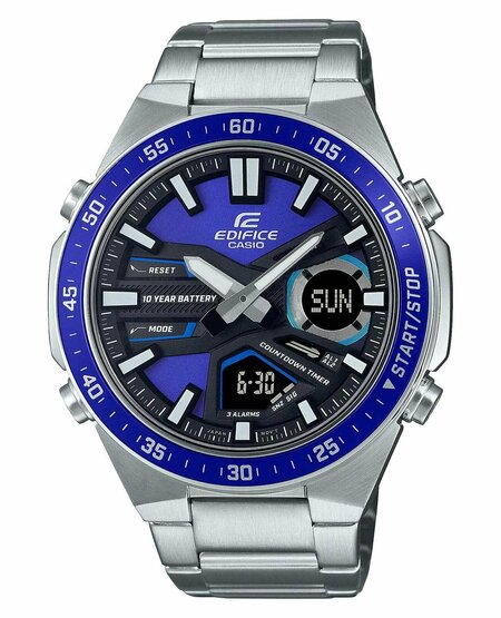 Японские мужские часы-хронограф Casio Edifice EFV-C110D-2A. Минеральное стекло устойчивое к появлению царапин, обладающее высокой прозрачностью. Корпус часов изготовлен из нержавеющей стали. Безель из стали с IP-покрытием. Светодиодная автоподсветка Neobrite - при повороте часов в сторону лица подсветка дисплея осуществляется автоматически. Настраиваемое послесвечение 1,5 или 3сек. Секундомер с точностью измерения 1/100 секунды и измерением до 23 часов 59 минут 59,99 cек. Таймер обратного отсчета (диапазон времени 24 часа), автоматический календарь, 12/24 отображение времени. Мировое время – 30 городов (29 часовых поясов). 3 будильника, один с функцией Snooze, ежечасный сигнал. Класс водозащиты: 100 метров, позволит плавать, нырять и заниматься другими водными видами спорта. Стальной браслет на раскладной застёжке.
