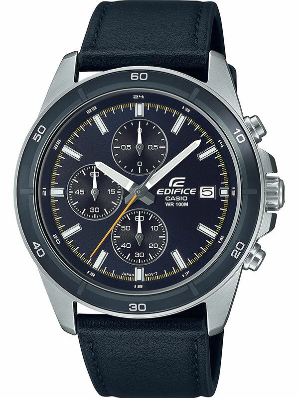 Мужские кварцевые наручные часы с хронографом (секундомером) Casio EFR-526D-1A коллекции Edifice. Калибр механизма — 5345. На данной модели отображается дата. Секундомер может отсчитывать до 59 минут 59 секунд с шагом 1/10 сек. Стрелки и метки покрыты люминесцентным напылением (светятся в темноте). На корпус частично нанесено стойкое PVD покрытие. Водонепроницаемость WR100 (10 атм). Завинчивающаяся задняя крышка. Размеры корпуса: (ШхВхТ) 43.8x48.6x11 мм. Гарантийный срок — 3 года (1 год от производителя + 2 года от магазина).