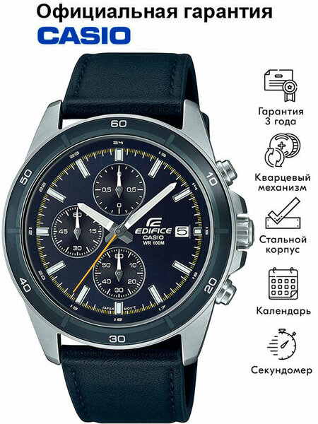 Мужские кварцевые наручные часы с хронографом (секундомером) Casio EFR-526L-2C коллекции Edifice. Калибр механизма — 5345. На данной модели отображается дата. Секундомер может отсчитывать до 59 минут 59 секунд с шагом 1/10 сек. Стрелки и метки покрыты люминесцентным напылением (светятся в темноте). На корпус частично нанесено стойкое PVD покрытие. Кожаный ремешок. Завинчивающаяся задняя крышка. Водонепроницаемость WR100 (10 атм). Размеры корпуса: (ШхВхТ) 43.8x48.5x11.6 мм. Гарантийный срок — 3 года (1 год от производителя + 2 года от магазина).