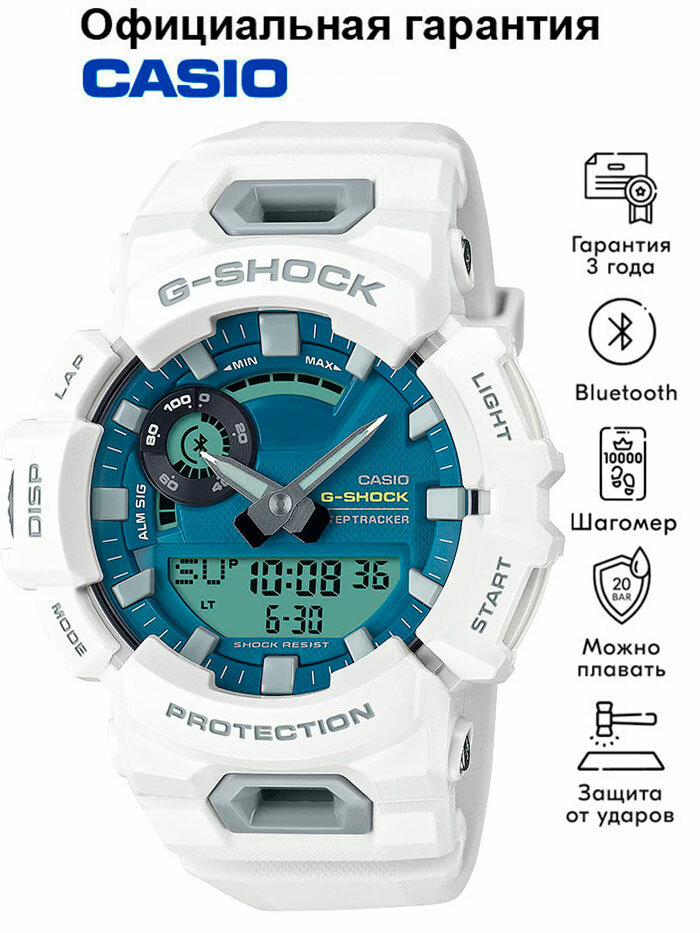 Противоударные кварцевые наручные часы Casio GBA-900-7A коллекции G-Shock с модулем Bluetooth Smart. Калибр механизма — 5641. Данная модель предназначена для занятия бегом и оснащена трехосевым акселерометром для точности считывания движений человека в пространстве. С помощью синхронизации со смартфоном через модуль Bluetooth и приложения G-SHOCK Move® можно увидеть график активности в метаболическом эквиваленте за день, неделю или месяц. Во время бега часы измеряют не только пройденные шаги, но и дистанцию, затраченные калории и определяют скоростной режим. В приложении G-Shock Move отображается пятиступенчатая шкала интенсивности тренировок с отслеживанием дневной активности. Здесь также можно задавать цели для лучшей мотивации. Для интервальных тренировок предусмотрен таймер (5 наборов по 20 сетов) с автоповтором и отложенным стартом и память на 45 кругов для секундомера. Для секундомера предел измерения составляет 24 часа (с точностью 1/100 секунды). Функциональность данной модели: шагомер, формат времени 12/24, автоматический календарь до 2099 года, функция летнего времени (DST), функция двойного времени, 5 независимых будильников, сигнал начала часа, таймер (5 наборов по 20 сетов), секундомер с точностью 1/100 секунды и измерением до 23 часов 59 минут 59,99 cек. и записью данных (до последних 45 записей: месяц начала измерения, дата, час, минута, время прохождения круга/разделения, общее время, дистанция, средний темп, сожженные калории, номер круга, времядистанция, средний темп каждого круга / разделения), таймер обратного отсчета для измерения интервалов (до пяти временных настроек) единица измерения: 1 секунда, диапазон ввода: от 00'00" до 60'00" (с шагом в 1 секунду), автоповтор таймера, автоматический запуск 5-секундного обратного отсчета, повторение (от 1 до 20 раз), двойная диодная подсветка циферблата с возможностью выбора времени свечения (1.5 или 3 секунды) + необритовое (Neobrite) покрытие на стрелках для длительного послесвечения в темноте, функция выключения звука нажатия кнопок (Mute), функция сдвига стрелок в нейтральное положение для удобства обзора цифровой индикации, индикация входящих вызовов, функция поиска телефона - при нажатии кнопки на ваших часах смартфон подает звуковой сигнал, имеется режим энергосбережения и предупреждение о низком заряде батареи. Водонепроницаемость WR200 (20 атм). Размеры корпуса: (ШxВxТ) 48.9x51.3x16.6 мм. Гарантийный срок — 3 года (1 год от производителя + 2 года от магазина).