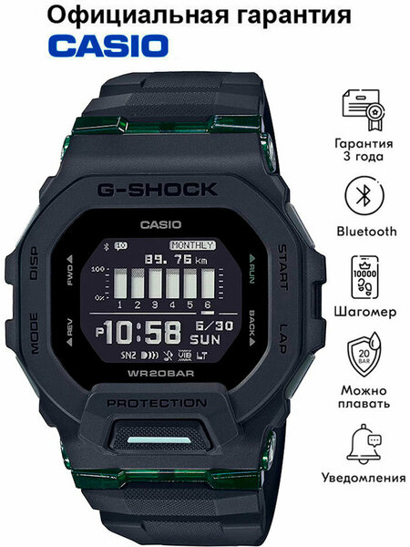 Противоударные кварцевые мужские наручные часы Casio GBD-200UU-1 коллекции G-Shock с цифровой индикацией времени, функцией шагомера и технологией Bluetooth® Smart. Калибр механизма — 3506. С помощью Bluetooth® вы можете подключить часы к смартфону и с помощью приложения G-SHOCK Move® получить доступ к полезным функциям. Часы автоматически связываются с телефоном через Bluetooth® и проверяют точность времени 4 раза в сутки. Просмотр количества шагов за 24 часа, интенсивность упражнений и физических нагрузок. Просмотр еженедельного количества шагов и числа сожженных калорий. Просмотр информации секундомера о времени прохождения кругов или промежуточных результатах (до 100 записей). Настройка мирового времени (300 городов). Функция поиска телефона, можно включить тоновый сигнал на телефоне, что позволит быстро найти телефон. Функциональность данной модели: формат времени 12/24, автоматический календарь до 2099 года, мировое время в 38 городах (38 часовых поясов); функция летнего времени (DST), функция двойного времени, 4 независимых будильника, секундомер с измерением до 100 часов, память на 100 кругов (100 записей), 5 независимых таймеров обратного отсчета (диапазон времени 60 минут), диодная подсветка циферблата с функцией авто (включается при наклоне часов на 40°) и возможностью выбора времени свечения (1.5 или 3 секунды), режим выключения звука нажатия кнопок (Mute), режим энергосбережения (дисплей гаснет для экономии энергии на 3 часа каждый день), режим полета (авиа режим), функция тренировки: отображение расстояния, скорости, темпа и других расчетных значений на основе акселерометра, автоматическое / ручное время прохождения круга, автоматическая пауза, вкл/выкл оповещения о цели (время, потраченные калории), настройка дисплея тренировки (прошедшее время, дистанция, темп, время прохождения круга, дистанция круга, темп круга, средний темп, скорость, средняя скорость, сожженные калории). Журнал тренировок: ежедневное отображение данных (количество шагов), ежемесячное отображение данных (пробег), данные о тренировках (до 100 пробежек, до 140 кругов за пробежку), затраченное время, дистанция, темп, сожженные калории. Уведомления с функцией вибро о новых/пропущенных звонках, сообщениях, email письмах и напоминаний из расписания. Водонепроницаемость WR200 (20 атм). Размеры корпуса: (ШxВxТ) 45.9x49.4x15 мм. Гарантийный срок — 3 года (1 год от производителя + 2 года от магазина).