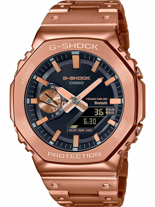 Мужские противоударные кварцевые наручные часы японского производства на солнечной батарее Casio GM-B2100BPC-1A коллекции G-Shock с цифровой+стрелочной индикацией времени с модулем Bluetooth® Smart. Калибр механизма — 5691. Аккумулятор данной модели заряжается от любого источника света. Срок работы аккумулятора с полным зарядом — около 7-ми месяцев при обычном использовании без воздействия света после зарядки и 18 месяцев при хранении в полной темноте с включенной функцией энергосбережения после полной зарядки. Имеется режим энергосбережения (дисплей гаснет для экономии энергии, когда часы остаются в темноте). Примерный срок службы аккумулятора — не менее 10 лет. Корпус выполнен из нержавеющей стали. С помощью Bluetooth® вы можете подключить часы к смартфону и с помощью приложения CASIO WATCHES получить доступ к полезным функциям. Часы автоматически связываются с телефоном через Bluetooth® и проверяют точность времени 4 раза в сутки. Функция поиска телефона, можно включить тоновый сигнал на телефоне, что позволит быстро найти телефон. Настройка и управление таймером, секундомером и будильником. Установка напоминания. Запись текущего местоположения (TIME and PLACE). Можно проверить уровень заряда аккумулятора. Функциональность данной модели: формат времени 12/24, автоматический календарь до 2099 года, возможность установки индикации дня недели на одном из шести языков (в том числе на русском), функция летнего времени (DST), мировое время в 38 городах (38 часовых поясов), 5 независимых будильников, сигнал начала часа, секундомер с точностью 1/100 секунды и измерением до 59 минут 59 cек, таймер обратного отсчета (диапазон времени 60 минут) с шагом 1 сек, двойная сверхяркая диодная подсветка циферблата с возможностью выбора времени свечения (1.5 или 3 секунды), функция выключения звука нажатия кнопок (Mute), функция смещения стрелок для удобного просмотра информации на цифровом экране, функция поиска телефона (при нажатии кнопки на ваших часах смартфон подает звуковой сигнал). Стрелки и метки покрыты необритовым (Neobrite) люминесцентным напылением (светятся в темноте). Модуль часов снабжен элементами из материала alphaGEL, который еще лучше защищает часы от сотрясения и вибрации. AlphaGEL представляет собой гибкую силиконовую прослойку, оказывающую амортизирующий эффект. Завинчивающаяся задняя крышка часов. Литой стальной браслет. Водонепроницаемость WR200 (20 атм). Японская сборка (Made In Japan). Размеры корпуса: (ШxВxТ) 44.4x49.8x12.8 мм. Гарантийный срок — 3 года (1 год от производителя + 2 года от магазина).