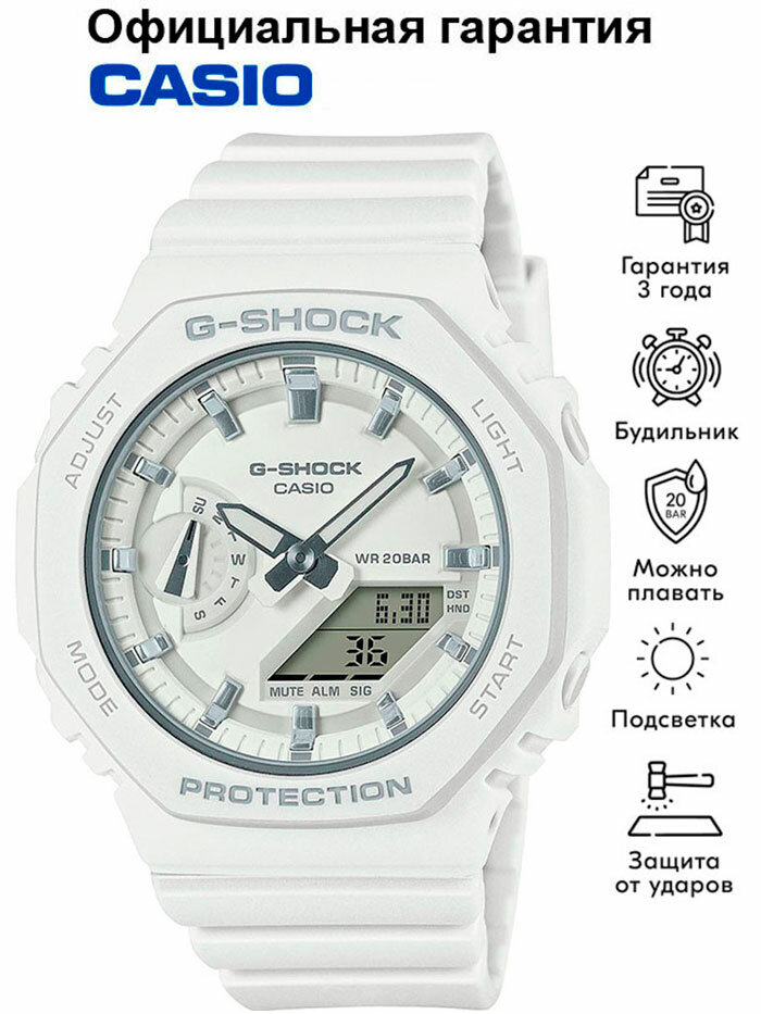 Противоударные женские кварцевые наручные часы Casio GMA-S2100NC-4A2 коллекции G-Shock с цифровой+стрелочной индикацией времени. Тонкий корпус для данной коллекции — 11.2 мм. Калибр механизма — 5611. Корпус усилен углеродным волокном, изготовленным по технологии Carbon Core Guard. Функциональность данной модели: формат времени 12/24, автоматический календарь до 2099 года, функция летнего времени (DST), мировое время в 48 городах (31 часовой пояс), 5 независимых будильников, сигнал начала часа, секундомер с точностью 1/100 секунды и измерением до 23 часов 59 минут 59 cек, таймер обратного отсчета (диапазон времени 24 часа), двойная диодная подсветка циферблата с возможностью выбора времени свечения (1.5 или 3 секунды) + необритовое (Neobrite) покрытие на стрелках для длительного послесвечения в темноте, функция выключения звука нажатия кнопок (Mute), функция смещения стрелок для удобного просмотра информации на цифровом экране. Индикатор в виде листа базилика на циферблате со вставкой в положении "9 часов". Водонепроницаемость WR200 (20 атм). Размеры корпуса: (ШxВxТ) 42.9x46.2x11.2 мм. Гарантийный срок — 3 года (1 год от производителя + 2 года от магазина).