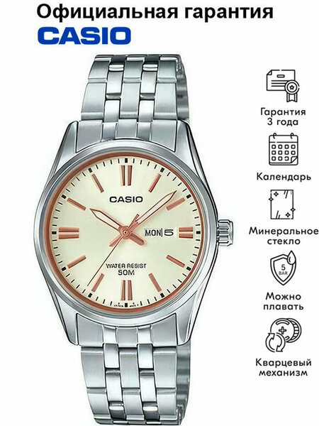 Женские кварцевые наручные часы Casio LTP-1335D-9A. Калибр механизма — 5237. Стрелки покрыты люминесцентным напылением (светятся в темноте). На циферблате присутствует индикация дня недели и текущей даты. Стальной браслет. Водонепроницаемость WR50 (5 атм). Размеры корпуса: (ШxВxТ) 30x36x8.9 мм Гарантийный срок — 3 года (1 год от производителя + 2 года от магазина).