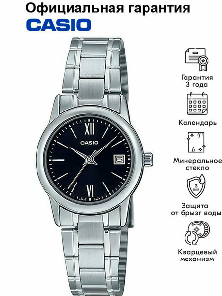 Женские кварцевые наручные часы Casio LTP-V002D-1B3. Калибр механизма — 3363. На данной модели отображается текущая дата. Стальной браслет. Водонепроницаемость WR (3 атм). Размеры корпуса: (ШxВxТ) 25x31x9.2 мм. Гарантийный срок — 3 года (1 год от производителя + 2 года от магазина).