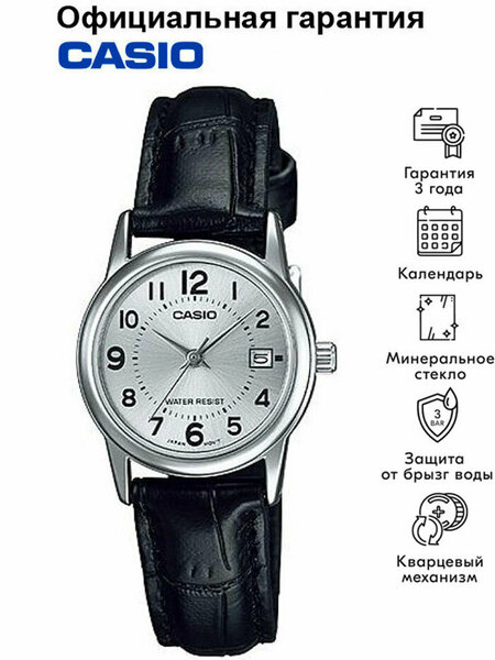 Женские кварцевые наручные часы Casio LTP-V002L-7B. Калибр механизма — 3363. На циферблате присутствует индикация текущей даты. Ремешок из искусственной кожи. Водонепроницаемость WR (3 атм). Размеры корпуса: (ШxВxТ) 25x31x9.2 мм Гарантийный срок — 3 года (1 год от производителя + 2 года от магазина).
