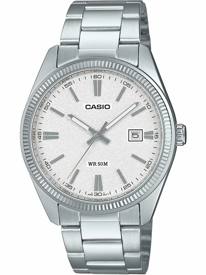 Мужские кварцевые наручные часы Casio MTP-1302D-1A1. Калибр механизма — 2784. На данной модели отображается текущая дата. Стрелки покрыты люминесцентным напылением (светятся в темноте). Стальной браслет. Водонепроницаемость WR50 (5 атм). Размеры корпуса: (ШxВxТ) 38.5x44.2x9.2 мм Гарантийный срок — 3 года (1 год от производителя + 2 года от магазина).