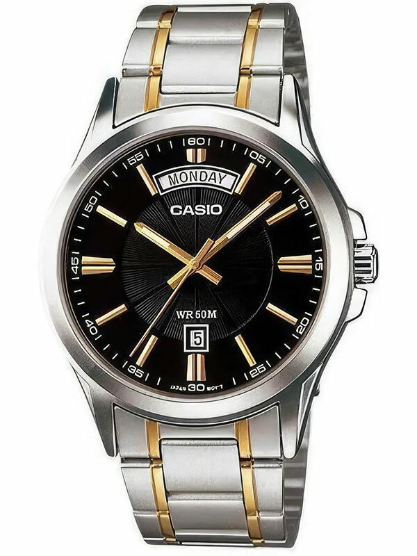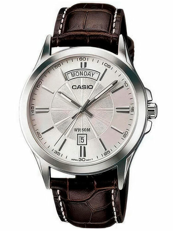 Мужские кварцевые наручные часы Casio MTP-1381D-7A. Калибр механизма — 5336. На данной модели отображается день недели и текущая дата. Стрелки покрыты люминесцентным напылением (светятся в темноте). Стальной браслет. Водонепроницаемость WR50 (5 атм). Размеры корпуса: (ШxВxТ) 39.9x46.6x8.9 мм. Гарантийный срок — 3 года (1 год от производителя + 2 года от магазина).