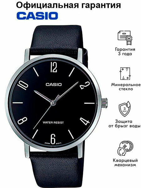 Мужские кварцевые наручные часы Casio MTP-VT01L-1B2. Калибр механизма — 1330. Ремешок из искусственной кожи. Водонепроницаемость WR (3 атм). Размеры корпуса: (ШхВхТ) 40x46x8.2 мм Гарантийный срок — 3 года (1 год от производителя + 2 года от магазина).