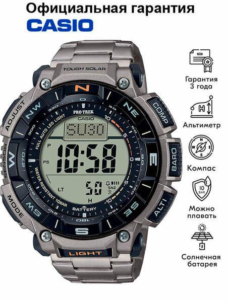 Мужские кварцевые наручные часы на солнечной батарее Casio PRG-340T-7 коллекции Pro Trek с цифровой индикацией времени. Калибр механизма — 3513. Аккумулятор данной модели заряжается от любого источника света. Срок работы аккумулятора с полным зарядом — около 6-ти месяцев. Примерный срок службы аккумулятора — 10 лет. Имеется режим энергосбережения (дисплей гаснет для экономии энергии, когда часы остаются в темноте) и индикатор уровня заряда батареи. Функциональность данной модели: формат времени 12/24, автоматический календарь до 2099 года, функция летнего времени (DST), мировое время 48 городов (31 часовой пояс), 5 независимых будильников, сигнал начала часа, секундомер с точностью 1/10 секунды и измерением до 999 часов 59 минут 59,99 cек, таймер обратного отсчета (диапазон времени 24 часа), отображение времени восхода и захода солнца, термометр, барометр, высотомер, цифровой компас. Функция выключения звука нажатия кнопок (Mute). Диодная подсветка циферблата с функцией авто (включается при наклоне часов на 40°) с возможностью выбора времени свечения (1.5 или 3 секунды). Вращающийся безель со шкалой солнечного компаса (Азимут). Титановый браслет. Устойчивость к низким температурам (до -10℃) . Водонепроницаемость WR100 (10 атм). Размеры корпуса: (ШхВхТ) 51.7x54.7x15.1 мм Гарантийный срок — 3 года (1 год от производителя + 2 года от магазина).