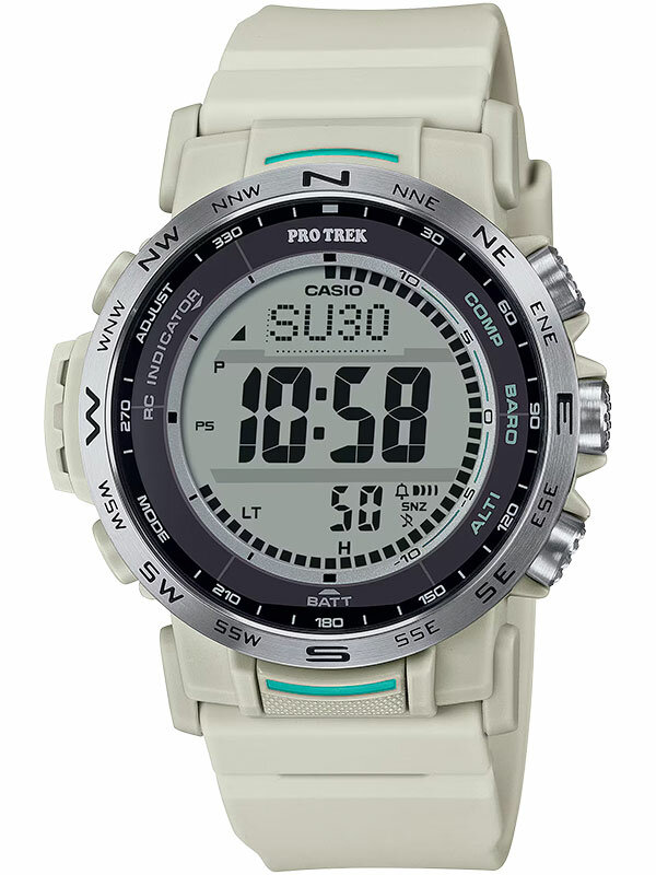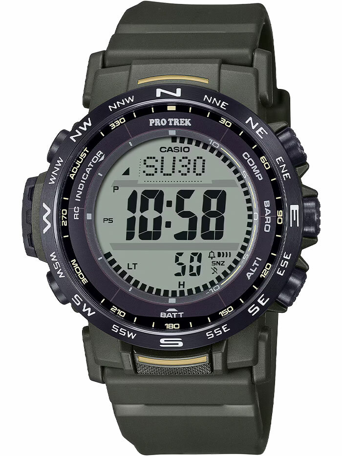 Многофункциональные наручные часы с компасом, термометром, барометром и высотомером Casio PRW-35-1A коллекции Pro Trek на солнечной батарее. Калибр механизма — 3490. Аккумулятор данной модели заряжается от любого источника света. Срок работы аккумулятора с полным зарядом — около 6-ти месяцев при обычном использовании без воздействия света после зарядки и 22 месяца при хранении в полной темноте с включенной функцией энергосбережения после полной зарядки. Примерный срок службы аккумулятора — 10 лет. Функциональность данной модели: радиоконтроль точного времени (Wave Ceptor); просмотр времени восхода/заката солнца; цифровой компас; записная книжка компаса; высотомер (до 10 000 м) с записью данных; барометр с графиком атмосферного давления (измерения каждые 2 часа); термометр (-10°C / +60°C); функция энергосбережения (дисплей гаснет для экономии энергии, когда часы остаются в темноте); индикатор уровня заряда батареи; формат времени 12/24; функция летнего времени (DST); мировое время 48 городов (31 часовой пояс); двойное время; автоматический календарь до 2099 года; 5 независимых будильников; сигнал начала часа; секундомер с точностью 1/10 секунды и измерением до 999 часов 59 минут 59,99 cек; таймер обратного отсчета (диапазон времени 24 часа); светодиодная подсветка циферблата с функцией авто (включается при наклоне часов на 40°) и возможностью выбора времени свечения (1.5 или 3 секунды); функция выключения звука нажатия кнопок (Mute). Устойчивость к низким температурам — до -10°C. Корпус из пластика и нержавеющей стали. Водонепроницаемость WR100 (10 атм). Размеры корпуса: (ШxВxТ) 44.6x51.2x13 мм. Гарантийный срок — 3 года (1 год от производителя + 2 года от магазина).