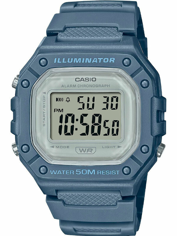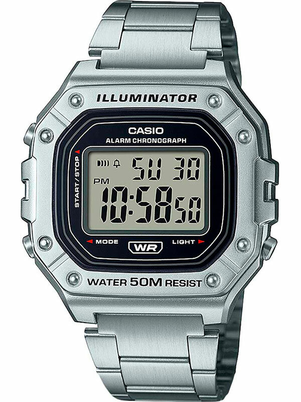 Электронные кварцевые наручные часы Casio W-218HC-4A с цифровой индикацией времени. Калибр механизма — 3224. Функциональность данной модели: формат времени 12/24, автоматический календарь до 2099 года, будильник, сигнал начала часа, секундомер с точностью 1/100 секунды и измерением до 59 минут 59,99 cек, диодная подсветка циферблата. Размеры корпуса: (ШxВxТ) 43.2x44.4x10.8 мм. Гарантийный срок — 3 года (1 год от производителя + 2 года от магазина).