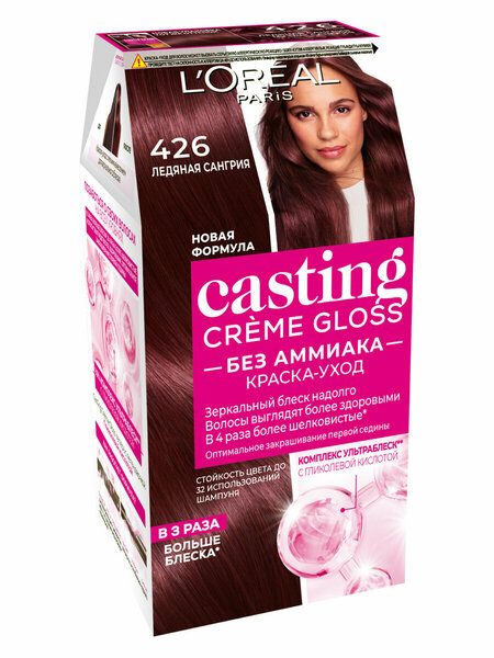 Достоинства:Краска для волос Лореаль Кастинг. Хорошо закрашивает седину, не смывается, не жжёт не раздражает кожу головы, не печет при окрашивании, не красит кожу головы и лица, не нужно отмывать после окрашивания с тех мест на которые случайно попала, цвет соответствует заявленному. Идеально подходит моим волосам. Волосы блестящие после применения. Очень приятный аромат, краска без аммиака, не бьёт в нос и в слизистую глаз. Цвет 302 мне понравился Недостатки:Нет Комментарий:Удобно пользоваться. Долго искала краску которая не раздражает кожу головы и полностью закрашивает седину. Нашла на Яндекс, цена по акции 3 по цене 2 , спасибо. Буду покупать ещё. пробую разные оттенки. чтобы цвет был насыщенный но не темный разбавляю состав водой так как часто крашу седые корни и берется темнее цвет на концах волос