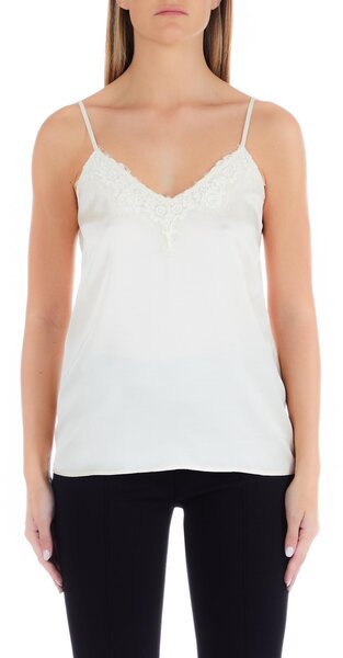 Женский топ из вискозного атласа с кружевной отделкой, на тонких бретелях и металлическим логотипом сзади. Производство: Италия.