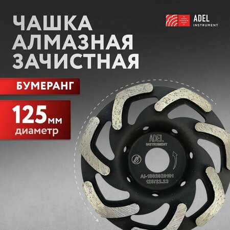 Шлифовальная алмазная чашка Adel Instrument Boomerang (Адель Инструмент Бумеранг) предназначена для различных видов работ, связанных с зачисткой и шлифовкой бетона, кирпича, гранита, природного камня. Расположенеие сегментов и их форма в виде бумеранга создают во время обработки практически сплошную плоскость, что дает возможность получить в результате гладкую поверхность. Шлифовальная алмазная чашка Adel Instrument Boomerang применяется для следующих видов работ: шлифовка и выравнивание швов; удаление наплывов; выравнивание стыков; снятие старых покрытий (битумные, эпоксидные, краска); выравнивание поверхности, деликатное снятие тонких слоев на материалах высокой твердости. Алмазная чашка Adel Instrument служит в качестве сменной оснастки для УШМ. При выполнении работ рекомендуется использовать пылеотводящую насадку совместно со строительным пылесосом. Характеристики: Диаметр диска - 125мм Тип алмазного сегмента - бумеранг Тип шлифования - сухой Высота алмазного слоя - 6мм Количество сегментов - 7 Посадочный диаметр - 22,2мм Максимальные обороты вращения (RPM): 12200 об/мин Комплектация: чашка алмазная 125мм