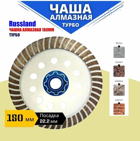 Алмазная турбо-чашка Russland 18 см: превосходное качество и долговечность Алмазная турбо-чашка Russland 18 см предназначена для зачистки и шлифования бетонных, мраморных и гранитных плит, а также кирпича и камня. Благодаря двухрядной кромке, она обеспечивает быструю и качественную обработку твердых материалов, создавая гладкие и красивые поверхности. Изготовлена из прочной углеродистой стали, чашка алмазная Russland Turbo 180 обладает высокой стойкостью к износу и коррозии. Алмазное напыление гарантирует долгий срок службы и высокую производительность инструмента. Посадочный диаметр чашки составляет 22,23 мм, что позволяет использовать ее с большинством стандартных шлифовальных машин. Выбирая алмазную турбо-чашку Russland 18 см, вы получаете надежный и долговечный инструмент, который поможет вам быстро и качественно обработать различные материалы, создавая при этом гладкие и красивые поверхности.