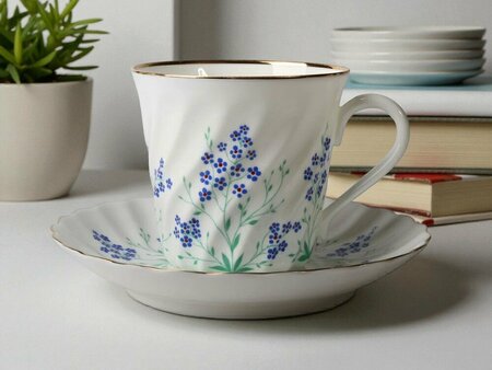 Кофейная пара "У ручья" - это изысканный выбор для любителей кофе и ценителей качественного фарфора. Изготовленная из костяного фарфора на Императорском фарфоровом заводе, эта пара станет прекрасным подарком на любой праздник. Роспись выполнена в технике надглазурной живописи надглазурными красками. По тулову чашки и борту блюдца изображение тонких кустиков незабудок. Кистью вручную нанесена отводка золотосодержащим препаратом по краю чашки и блюдца. Изображение тонких кустиков незабудок украшает тулово чашки и борт блюдца, создавая атмосферу уюта и гармонии. Особенностью данной модели является отводка золотом по краю чашки и блюдца, выполненная вручную кистью. Это придает паре особый шик и делает ее еще более привлекательной для глаз. Кофейная пара "У ручья" изготовлена из высококачественного фарфора, что гарантирует ее прочность и долговечность. Материал не впитывает запахи и не деформируется при контакте с горячими напитками. В комплекте идут две единицы: чашка 155 мл. и блюдце.