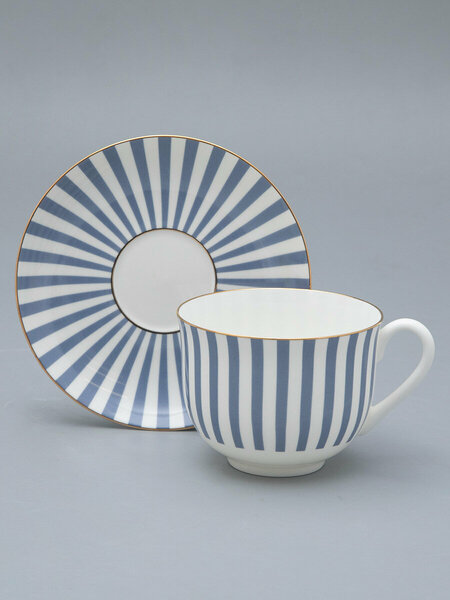 Чашка с блюдцем кофейная рис. "Да и Нет" на форме "Ландыш" изготовлена из костяного фарфора. Для декорирования используется надглазурная деколь, отводка золотом. Автор росписи - художник Императорского фарфорового завода Сергей Соколов, форма восстановлена по музейному образцу. Изделие впервые поступило в продажу в 2002 году. Роспись серии чашек «Да и нет» гениально проста: ритмичное чередование белых и цветных полос. Белый цвет – это цвет самого материала. Дополнительный тон выбран художником не случайно: он должен составлять с фарфоровым фоном гармоничный контраст и динамику.