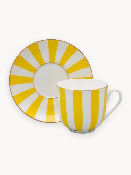 Чашка с блюдцем кофейная рис. "Да и Нет. Желтый" на форме "Ландыш" изготовлена на Императорском фарфоровом заводе из костяного фарфора. Для декорирования используется надглазурная деколь, отводка золотом. Автор росписи - художник Императорского фарфорового завода Сергей Соколов, форма восстановлена по музейному образцу. Изделие впервые поступило в продажу в 2002 году. Роспись серии чашек «Да и нет» гениально проста: ритмичное чередование белых и цветных полос. Белый цвет – это цвет самого материала. Дополнительный тон выбран художником не случайно: он должен составлять с фарфоровым фоном гармоничный контраст и динамику.