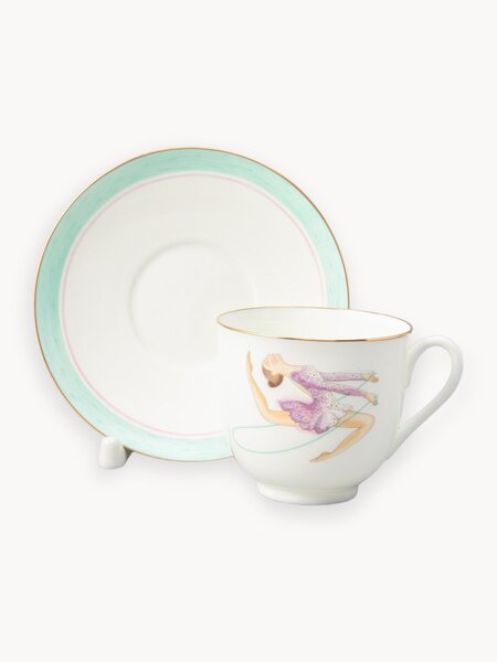 Из серии "Художественная гимнастика" (2020 год). Костяной фарфор, надглазурная деколь, отводка золотом. Автор рисунка - Любовь Цветкова, форма восстановлена по музейному образцу.