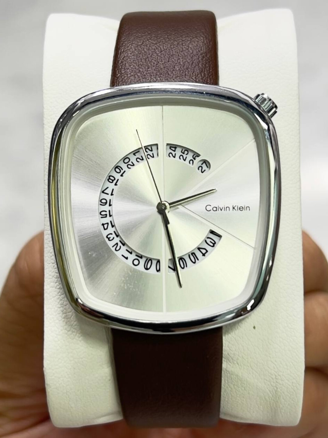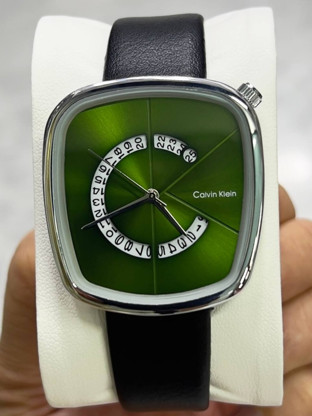 Циферблат часов серебристый и имеет эффект металлического блеска, что придает им роскошный вид. 24-часовой индикатор уникального дизайна расположен в форме спирали. Вместо цифр используются индикаторы в форме четких линий, что обеспечивает современный и технологичный вид. В центре расположены маленькие и изящные часовая и минутная стрелки. Форма корпуса и материал: Прямоугольно-круглый гибридный корпус сочетает в себе классический и современный стиль. Технические характеристики: Тип механизма: Высока вероятность, что в часах использован кварцевый механизм. Такой механизм известен своим точным и постоянным отображением времени. Для контроля сбоку имеется традиционная заводная головка (коронка). Водонепроницаемость: Часы Calvin Klein обычно водонепроницаемы на глубине до 30 метров и более. Это позволяет сохранить часы в безопасности во время дождя или ежедневного контакта с водой. Размер: Скорее всего, это будут часы-унисекс, то есть ими смогут пользоваться как мужчины, так и женщины. Диаметр корпуса может составлять около 38-42 мм. --- Универсальность: Эти часы идеально подходят для использования в следующих ситуациях: Для офиса и работы: подходит для профессиональной среды благодаря минималистическому внешнему виду и серьезному дизайну. Для повседневного использования: простой и удобный, но элегантный. Для мероприятий или встреч: уникальный дизайн часов идеально подойдет любителям покрасоваться. ---