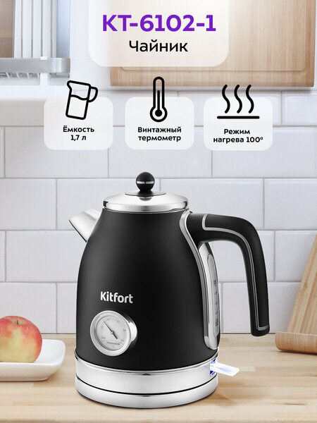 Для ценителей чая Чайник Kitfort КТ-6102 имеет встроенный термометр, выполненный в винтажном стиле. Это очень удобно для заваривания различных напитков, для которых требуется определённая температура воды. Например, зелёный чай, белый чай, кофе и тд. Оригинальный дизайн Необычная форма корпуса, стильный дизайн и оригинальные цветовые решения сделают чайник украшением вашей кухни Для вашего удобства Крышка чайника полностью съёмная, что облегчает доступ внутрь чайника. Горячий приём За один раз в чайнике можно вскипятить до 1.7 л воды. Этого хватит, чтобы приготовить горячие напитки на большую семью Мерная шкала позволяет легко следить за уровнем воды. В кнопку включения/выключения встроен индикатор нагрева. Защита от накипи Специальная форма носика позволяет точно наливать воду в чашку без расплёскивания и брызг и быстро наполнять её. В носике чайника расположен съёмный фильтр от накипи, который задерживает частички накипи и предотвращает их попадание в чашку. Заботимся о вашей безопасности Чайник оснащён контроллером Strix - 1 среди поставщиков компонентов для электрочайников. Он устраняет риски короткого замыкания и возгорания прибора. Обеспечивает защиту при закипании, при включении чайника без воды и при снятии с базы во время работы. Характеристики: Режим нагрева: 100 С Ёмкость: 1.7 л Мощность: 18002150 Вт Цвет: черный с серебром Размер чайника: 25х17.5х27 см Вес чайника: 1.2 кг