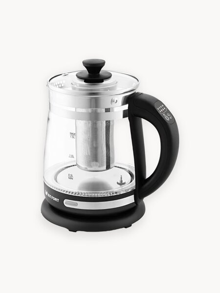 Чайник «2 в 1» Kitfort KT-656 с электронным терморегулятором позволит не только вскипятить воду, но и нагреть ее до температуры 40, 70, 80 и 90 градусов, что очень удобно для заваривания различных сортов чая, кофе или для приготовления детского питания. Чайник оснащен функцией поддержания температуры. Корпус и крышка чайника выполнены из сочетания стекла и металла. В комплекте к чайнику идет специальная подставка для варки 5 яиц, яйца варятся прямо в чайнике. Используйте для этого режим «Варка яиц» при котором чайник будет кипеть непрерывно, а по истечении 12–15 минут отключится. В комплекте к чайнику идет специальный фильтр для заваривания чая. Заваривайте чай прямо в чайнике: нагрейте воду, засыпьте заварку в фильтр и установите его в чайник. Чтобы напиток не остыл, включайте подогрев. Возможности и функции: - кипячение - варка яиц - фильтр для заваривания чая - нагрев воды до 40, 70, 80 и 90 °C - поддержание температуры в течение 2 часов - автоматическое отключение при закипании - автоматическое отключение при снятии чайника с подставки - подсветка воды - звуковая и световая индикация событий