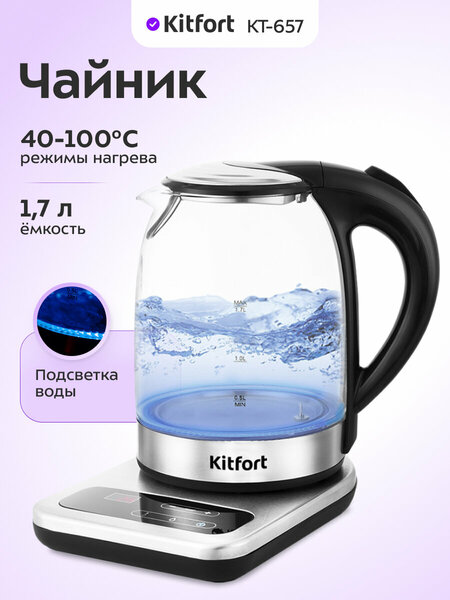 Электрический чайник Kitfort KT-657 с терморегулятором позволит не только вскипятить воду, но и нагреть ее до температуры от 40 до 100 градусов, что очень удобно для заваривания различных сортов чая, кофе или для приготовления детского питания. Чайник оснащен функциями поддержания температуры и самоочистки. Корпус и крышка чайника выполнены из стекла, а крышка и подставка — из сочетания пластмассы и нержавеющей стали. Благодаря режиму поддержания температуры вы можете наслаждаться вкусным чаем, не дожидаясь закипания или остывания до необходимой температуры. А чтобы очистить чайник от накипи воспользуйтесь функцией самоочистки, в процессе которой чайник будет непрерывно кипеть в течение трех минут. Возможности и функции - кипячение - нагрев воды от 40 до 100 °C с шагом 10 - поддержание температуры в течение 2 часов - автоматическое отключение при закипании - автоматическое отключение при снятии чайника с подставки в режиме кипячения и нагрева - подсветка воды - звуковая и цветовая индикация событий - самоочистка