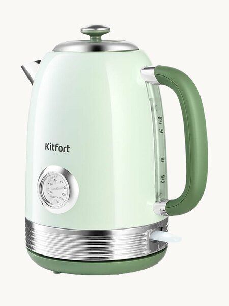 Чайник Kitfort КТ-имеет стильный и винтажный дизайн. Он станет украшением вашей кухни. А удобной термометр поможет при приготовлении напитков, для которых требуется точное значение температуры воды, вроде зелёного чая, белого чая, кофе и т. д. Форма корпуса, стильный дизайн и оригинальное цветовое решение выделят ваш чайник на кухне! Корпус и крышка прибора выполнены из нержавеющей стали. Ручка пластиковая, не нагревается и удобно лежит в руке. За один раз в чайнике можно вскипятить до 1,7 л воды. Этого хватит, чтобы приготовить горячие напитки на большую семью! Мерная шкала позволяет легко следить за уровнем воды. В кнопку включения/выключения встроен индикатор нагрева. Специальная форма носика позволяет точно наливать воду в чашку без расплёскивания и брызг и быстро наполнять её. Встроенный фильтр в носике не даст накипи попасть в напиток из чайника. Крышка чайника полностью съёмная, что облегчает доступ внутрь чайника. Нагревательный элемент (ТЭН) в донной части закрыт пластиной из нержавеющей стали. Это препятствует образованию накипи, облегчает уход и значительно снижает шум при нагревании воды. Подставка с центральным контактом даёт возможность располагать на ней чайник в любом положении, обеспечивая вращение на 360°.
