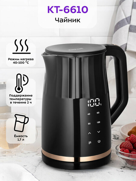 Электрический чайник КТ-6610 - отличное решение для ежедневного использования или особых моментов с родными и друзьями. Благодаря оригинальному дизайну он станет украшением вашей кухни. Вы можете выбрать 4 режима нагрева или самостоятельно настроить t °С от 40 до 95 °С с шагом 5 °С. Это крайне удобно для правильного заваривания разных сортов чая. Управление сенсорное, LED-дисплей показывает текущую t °С или заданную t °С нагрева. Чайник оснащён функцией поддержания t °С в течение 2 ч на заданном уровне. Температура задаётся либо кнопками выбора: 40, 60, 80 или 100°С, либо с помощью кнопок “Больше” или “Меньше” на панели управления. Горлышко большого диаметра и широко открывающаяся крышка позволяют легко наполнять водой, а также чистить чайник. Отметка максимального уровня воды располагается на внутренней поверхности прибора. Изнутри крышка и корпус выполнены из нержавеющей стали. Чайник имеет широкий носик, который даёт хорошую струю воды без брызг. Ручка пластиковая, не нагревается и удобно лежит в руке. Подставка с центральным контактом даёт возможность располагать на ней чайник в любом положении, обеспечивая вращение на 360°. При закипании чайник автоматически отключается. Прибор имеет защиту от перегрева и от включения без воды. На дне подставки имеется отсек для хранения шнура, чтобы его излишки не мешались на столе.
