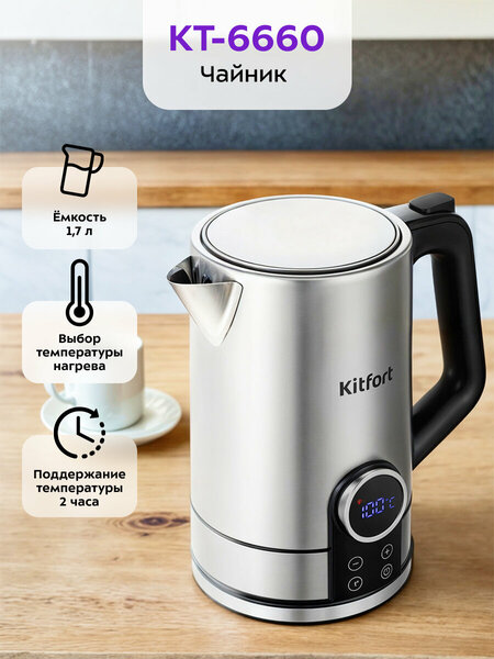 Чайник Kitfort КТ-6660 предназначен для кипячения воды дома, в офисе, на даче. Полный чайник закипает примерно за 5 минут. Чайник оснащён функцией поддержания температуры в течение 2 часов. Температура воды контролируется встроенным термодатчиком. На чайнике расположена панель управления и дисплей. На дисплее отображается текущая температура воды, а при установке — температура нагрева. КТ-6660 может не только вскипятить воду, но и нагреть её до 40, 50, 60, 70, 80, 90 или 95 °C. Корпус чайника выполнен из нержавеющей стали. Ручка выполнена из пластика, а крышка — из сочетания пластика и нержавеющей стали. Мерная шкала находится за ручкой чайника. Подставка с центральным контактом даёт возможность располагать на ней чайник в любом положении, обеспечивая вращение на 360°. Перед снятием чайника с подставки дождитесь его автоматического выключения или отключите его, нажав на переключатель.