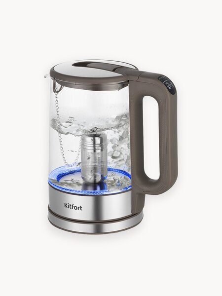 Чайник KT-6664 может не только вскипятить, но и нагреть воду до температуры 40, 70, 80 и 90°С. Возможность выбрать температуру нагрева в сочетании с встроенным фильтром позволяют заваривать любимые сорта чая прямо в чайнике. Кнопками на дисплее вы можете задать температуру нагрева в диапазоне 40, 70, 80, 90°С или включить режим нагрева воды до 100°С. Температура 40°С пригодится для приготовления детского питания. В чайнике КТ-6664 есть встроенный фильтр для заваривания чая, а также предустановлены температуры заваривания для популярных сортов чая. Вам нужно только засыпать чай в корзину, залить воду и выбрать нужную температуру. Чайник КТ-6664 имеет широко открывающуюся крышку и большое горлышко, что облегчает доступ внутрь чайника при его чистке и во время удаления накипи. В носике чайника расположен фильтр от накипи. Чайник оснащён функцией поддержания температуры. После включения режима чайник сначала нагреет воду, а затем будет поддерживать температуру воды 85-100°С в течение 2 часов. Световой индикатор при этом будет мигать красным цветом. При включении чайника по периметру дна загорается синяя подсветка, которая является индикатором работы и одновременно художественно подсвечивает кипящую воду. Подставка с центральным контактом даёт возможность располагать на ней чайник в любом положении, обеспечивая вращение на 360°. Снизу имеется отсек для хранения шнура, в который можно смотать излишки шнура электропитания, чтобы он не мешал на столе.