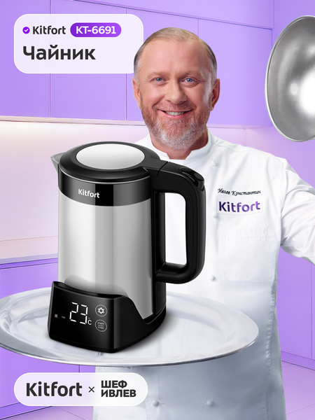 Для вкусного чаепития! Электрический чайник Kitfort КТ-6691 предназначен для кипячения воды дома, в офисе, на даче. Ёмкость чайника 1,5 литра: этого хватит, чтобы приготовить горячие напитки на большую семью. Полный чайник закипает за 7-8 минут. Простые настройки Кнопка «Старт/Стоп» включает и выключает чайник. Кнопка «Настройки» предназначена для выбора температурного режима: 45, 55, 80, 90 или 100°C, что очень удобно при заваривании различных сортов чая или детского питания. Нагревает и тепло сохраняет Чайник КТ-6691 оснащён функцией поддержания температуры в течение 6 часов после нагрева или кипячения воды. Температура воды контролируется встроенным в дно чайника термодатчиком и отображается на дисплее. Удобное использование Корпус чайника выполнен из нержавеющей стали и пластика. Ручка и подставка пластиковые, они не нагреваются, ручка удобно лежит в руке. Минимальная и максимальная отметки уровня воды нанесены внутри. Широкое горлышко облегчает доступ внутрь при мытье. Двойные стенки для сохранения тепла Внутренняя колба чайника КТ-6691 выполнена из нержавеющей стали. Двойные стенки дольше сохраняют тепло и защищают от ожогов, так как корпус снаружи почти не нагревается. Кнопка открытия крышки расположена на ручке. Ничего лишнего! Подставка с центральным контактом даёт возможность располагать на ней чайник в любом положении, обеспечивая вращение на 360°. Снизу имеется отсек для хранения шнура, в который можно смотать излишки шнура электропитания. Оригинальный дизайн Форма корпуса, минималистичный дизайн сделают чайник КТ-6691 украшением вашей кухни! Устройство автоматически отключается при закипании и снятии с подставки, имеет защиту от перегрева и включения без воды.