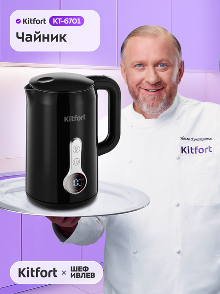 Для любителей чая! Элегантный чайник КТ-6701 с лаконичным дизайном станет стильным акцентом на вашей кухне. Он сочетает в себе современные технологии и удобство использования, делая процесс приготовления напитков простым и приятным. Температура, которая раскрывает вкус Чайник не только вскипятит воду, но и нагреет её от 40 до 90 °C с шагом 10 ° C — идеально для заваривания разных сортов чая. Функция поддержания температуры сохраняет тепло до 2 часов. Нагрев в ярких красках Вокруг дисплея расположен индикатор, который меняет цвет в зависимости от температуры воды. Это позволяет легко контролировать нагрев: вы сразу увидите, когда вода достигнет нужной температуры для заваривания чая или полностью вскипит. Удобство в мелочах Подставка с центральным контактом позволяет разместить чайник в любом положении, обеспечивая возможность вращения на 360 градусов. Крайне стойкий Корпус чайника и крышка выполнены из пластика, а их внутренняя поверхность — из нержавеющей стали. Ручка пластиковая, она не нагревается и удобно лежит в руке. Прослужит долго Чайник оснащён функцией автоматического отключения при закипании, защитой от перегрева и защитой от включения без воды. Эти функции обеспечивают безопасность и продлевают срок службы устройства, делая его использование максимально удобным и надёжным.