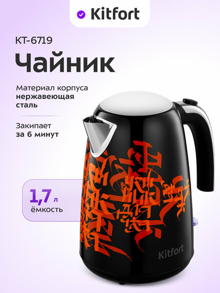 Согрей и пей! Электрический чайник Kitfort КТ-6719 предназначен для кипячения воды дома, в офисе, на даче. Ручка пластиковая, не нагревается и удобно лежит в руке. Удобно! Корпус чайника выполнен из нержавеющей стали, а крышка — из нержавеющей стали и пластика. КТ-6719 также оснащён фильтром от накипи. Простое управление Кнопка открывания крышки расположена на ручке чайника, а переключатель — под ручкой. При включении загорается подсветка переключателя. Продумано всё Полный чайник закипает примерно за 6 минут. Чайник автоматически отключается при закипании и снятии с подставки, имеет защиту от перегрева и от включения без воды. Без лишних проводов Подставка с центральным контактом даёт возможность располагать на ней чайник в любом положении, обеспечивая вращение на 360°. Снизу имеется отсек для хранения шнура, в который можно смотать излишки шнура электропитания, чтобы он не мешал на столе. Стильный дизайн Дизайн чайника создаёт ощущение движения и энергии благодаря линиям и формам. Оранжевый цвет контрастирует с чёрным фоном, привлекая внимание и создавая эффект глубины. Общий дизайн передает современность и креативность. Собери коллекцию! Чтобы ваши завтраки были не только вкусными, но и радовали глаз, мы создали для вас коллекцию из тостера КТ-6464 и чайника.