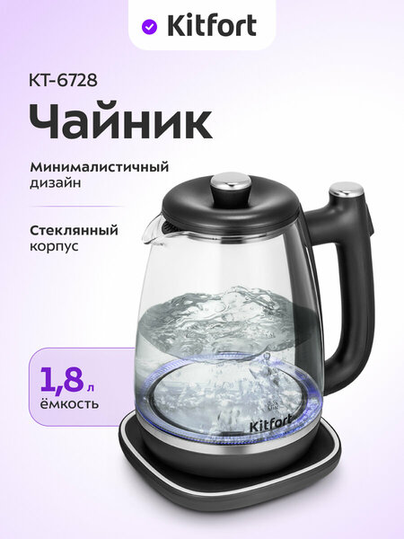 Горячий чай всегда под рукой Электрический чайник Kitfort КТ-6728 предназначен для кипячения воды дома, в офисе, на даче. Ёмкость чайника составляет 1,8 л. Просто и стильно Корпус чайника выполнен из стекла. Ручка чайника сделана из пластика, она не нагревается и удобно лежит в руке. Кнопка включения расположена на ручке сверху. Крышка удобно снимается для мытья и налива воды. Удобное хранение шнура Подставка с центральным контактом дает возможность располагать на ней чайник в любом положении, обеспечивая вращение на 360°. Снизу имеется отсек для хранения шнура, в который можно смотать излишки шнура электропитания, чтобы он не мешал на столе. Для домашнего чаепития! Чайник КТ-6728 автоматически отключается при закипании, имеет защиту от перегрева и от включения без воды.