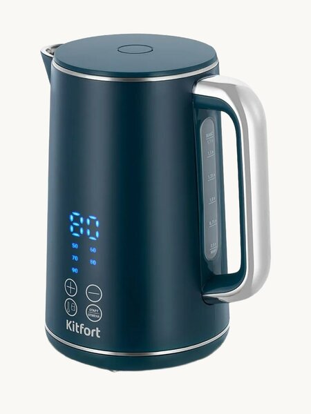 Чаю, сэр? Стильный яркий чайник Kitfort КТ-6784 предназначен для кипячения воды дома, в офисе, на даче. Ёмкость чайника 1,7 литра: этого хватит, чтобы приготовить горячие напитки на большую семью. Полный чайник закипает за 5 минут. Регулируйте нагрев и кипячение Кнопками «Больше/Меньше» регулируется температура от 50 до 100℃ с шагом 10℃ — удобно для заваривания чая и приготовления детского питания. Кнопка «Старт/Отмена» включает и отключает нагрев и поддержание температуры. Нагревает и тепло сохраняет Чайник КТ-6784 имеет функцию поддержания температуры воды в течение 30 минут. Для этого выберите температурный режим и нажмите на кнопку «Поддержание». Температура воды контролируется встроенным в дно чайника термодатчиком. Двойные стенки для сохранения температуры У КТ-6784 двойные стенки, благодаря чему вода будет дольше оставаться горячей. Внутренняя поверхность выполнена из нержавеющей стали, внешняя часть — из прочного пластика. Широкое горлышко облегчает чистку, а кнопка открывания расположена на крышке. Мерная шкала на корпусе Пластиковая ручка чайника не нагревается и удобно лежит в руке. На прозрачной части корпуса под ручкой расположена мерная шкала с отметками минимального и максимального уровня воды для удобного контроля наполнения. Заботимся о вашей безопасности! Чайник оснащён контроллером Strix - № 1 среди поставщиков компонентов для электрочайников. Он устраняет риски короткого замыкания и возгорания прибора. Обеспечивает защиту при закипании, при включении чайника без воды. Без лишних проводов Подставка с центральным контактом даёт возможность располагать на ней чайник в любом положении, обеспечивая вращение на 360°. Снизу имеется отсек для хранения шнура, в который можно смотать излишки шнура электропитания, чтобы он не мешал на столе. Украшение вашей кухни! Стильный корпус чайника окрашен в насыщенный тёмно-сине-зелёный оттенок, гармонично дополненный серебристыми акцентами на ручке и крышке, благодаря чему чайник станет яркам акцентом на вашей кухне!