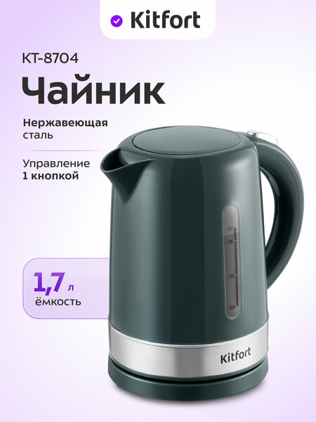 Вскипяти, завари, повтори! Электрический чайник Kitfort KT-8704 предназначен для быстрого кипячения воды дома, в офисе или на даче. Простой дизайн не будет создавать визуального шума и отлично впишется в пространство в спокойных оттенках. Тихая работа Чайник за раз может вскипятить до 1,7 л воды. Ручка не нагревается и удобно лежит в руке. Нагревательный элемент закрыт пластиной — это снижает шум при кипячении и упрощает уход. Лаконичный и простой! После нажатия на переключатель загорится световой индикатор, и прибор начнёт нагреваться. Когда вода закипит, чайник автоматически отключится. Чтобы открыть чайник, воспользуйтесь кнопкой на ручке. Защита от накипи Чайник автоматически отключается при закипании, имеет защиту от перегрева и от включения без воды. В носике чайника расположен фильтр, который задерживает частички накипи и предотвращает их попадание в чашку.