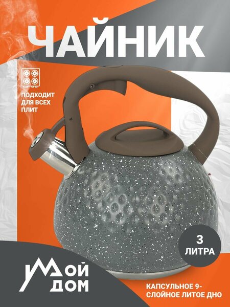 Чайник Мой Дом, нержавеющая сталь, 3 л, со свистком, сатинированный, серый