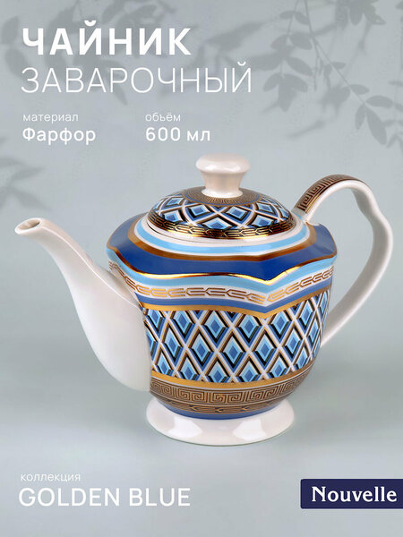 Коллекция восточной посуды из фарфора Golden Blue - это идеальный выбор для тех, кто ценит стиль и элегантность. Коллекция представлена в бело-голубых цветах с золотым декором, что придает ей изысканность и роскошь. Каждый предмет этой коллекции был тщательно разработан и изготовлен с использованием высококачественных материалов и с большим вниманием к деталям. Стиль Арт-деко, который вдохновил создателей этой коллекции, отлично подходит для современных интерьеров, добавляя им шарма и оригинальности. Однако, благодаря своей универсальности, коллекция Golden Blue также подойдет для классических интерьеров, создавая гармоничное сочетание старины и современности. Коллекция Golden Blue включает в себя различные предметы декора и посуды, чтобы удовлетворить все ваши потребности. Здесь вы найдете вазы, чайные и кофейные пары, блюда и множество других предметов, которые помогут вам создать неповторимый стол и впечатлить своих гостей. Каждый предмет этой коллекции упакован в подарочную упаковку, что делает их идеальным подарком для близких и друзей. Независимо от того, нужны ли вам предметы для повседневного использования или для особых случаев, коллекция Golden Blue гарантирует вам высокое качество и элегантный дизайн. Фарфоровый заварочный чайник "Golden Blue", 600 мл, Nouvelle В основании носика чайника есть отверстия для задерживания чаинок Рекомендации по использованию: СВЧ - нет. ПММ - нет. Размер штуки: 21х12х14,5 см Размер товара в упаковке: 19х12х14 см Материал: Фарфор. Вид упаковки: подарочная упаковка. Чайник заварочный фарфоровый 0,6л, может использоваться для заваривания чая и кофе, травяного и листового сбора, холодных и горячих напитков, сервировки праздничного новогоднего стола. Чайник фарфоровый может применяться как заварник, заварной чайник для заварки, восточная посуда для чая и кофе.
