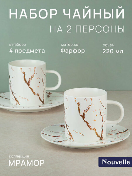 Чайный набор "Белый мрамор" от Nouvelle - это элегантный и функциональный набор посуды для сервировки стола на две персоны. Набор выполнен из высококачественного фарфора, что гарантирует его прочность и долговечность. Матовая поверхность с мраморным декором придает набору неповторимый вид и тактильные ощущения. В комплекте вы найдете две чашки объемом 220 мл каждая и два блюдца диаметром 15 см. Чайный набор упакован в индивидуальную брендированную коробку, что делает его отличным вариантом для подарка на любой праздник или просто для приятного сюрприза. Обратите внимание, что данный набор не предназначен для использования в СВЧ-печи и посудомоечной машине. Рекомендуется мыть посуду вручную с использованием мягких моющих средств. Выбирая чайный сервиз "Белый мрамор" от Nouvelle, вы получаете не только стильный и качественный набор посуды, но и возможность наслаждаться ароматным чаем в приятной атмосфере.