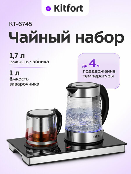 Для уютного чаепития! Чайный набор КТ-6745 состоит из чайника ёмкостью 1,7 л, заварочного чайника ёмкостью 1 л с фильтром и базы. Чайный набор позволяет не только вскипятить воду, но и заварить чай или кофе в заварочном чайнике. Выберите свой напиток! Сенсорная панель управления позволяет выбрать режим работы: «Чай» или «Кофе», выбрать температуру для режимов от 60 до 80 °С и от 75 до 85 °С и выключить устройство. Во время работы платформы с подогревом отображается установленная температура. Высококачественные материалы Корпус чайника ёмкостью 1,7 литра выполнен из стекла, пластика и нержавеющей стали. Заварочный чайник ёмкостью 1 литр изготовлен из термостойкого стекла и имеет съемный фильтр из нержавеющей стали. Оба чайника легко очищаются после использования. Компактные размеры На базе расположена кнопка включения поддержания тепла, а сама база изготовлена из пластика. На базе компактно располагается чайник и кувшин. Небольшие габариты чайной станции позволяют расположить её практически в любое удобное место.