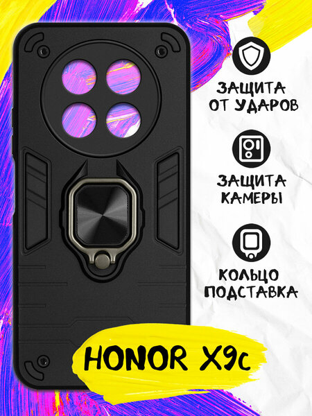 Противоударный чехол для Honor X9C, Honor X60 Pro и Honor Magic7 Lite. Чехол изготовлен из комбинации пластика и термопластичного полиуретана (TPU), что обеспечивает его ударопрочность и долговечность. Черный цвет чехла придает ему элегантный и стильный вид. Особенностью чехла является его функциональность. Он не только защищает ваш смартфон от падений и ударов, но и может использоваться как подставка для просмотра видео или чтения. Магнитный держатель обеспечивает надежное сцепление с магнитом, а кольцо можно надевать на палец, когда вы держите телефон в руке. Чехол также обеспечивает защиту выступающей камеры вашего смартфона, что особенно важно для любителей качественных снимков. Чехол не имеет застежки, что облегчает его установку и снятие. В целом, этот чехол станет отличным выбором для тех, кто ценит надежность, функциональность и стиль в одном продукте.