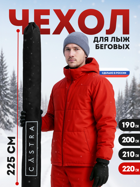 Высококачественный чехол для беговых лыж Virage Castra длиной 220 см предназначен для хранения спортивного инвентаря и помогает избежать поломок и сколов лыж во время их транспортировки на тренировку и обратно. Чехол изготовлен из прочной и легкой ткани. В нем свободно помещается одна пара беговых лыж и одна пара лыжных палок. Можно поместить две пары лыж. Надевается сверху на лыжи, затягивается на шнурок. Данный чехол шьется без молнии: он компактен и его можно свернуть и положить в карман, пока Вы катаетесь на лыжах. Если Вам нужен чехол с молнией, обратите внимание на нашу модель чехла для лыж Cruise. Высота чехла 220 см, Ширина чехла 23 см. Подходит для лыж до 215см. Сделано в России. чехол для лыж/чехол/чехол спортивный/лыжи/для лыж/аксессуары для лыж/