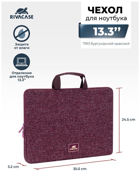 Чехол для ноутбука RIVACASE 7913 burgundy red 13.3" - это стильный и функциональный аксессуар, который обеспечит надежную защиту вашего ноутбука или планшета с диагональю экрана до 13.3 дюймов. Чехол выполнен из высококачественной водоотталкивающей ткани, что гарантирует защиту вашего устройства от влаги и пыли. Мягкая плюшевая подкладка обеспечивает дополнительный комфорт при использовании. Специальные внутренние накладки по углам чехла надежно фиксируют гаджет и предотвращают случайное выпадение. Внешний карман на молнии позволяет хранить аксессуары, смартфон и документы. Удобные ручки для транспортировки делают чехол легким и компактным, что позволяет носить его с собой в любой ситуации. Чехол для ноутбука RIVACASE 7913 burgundy red 13.3" - это не только стильный аксессуар, но и надежный защитник вашего устройства.